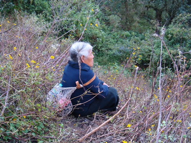 Finally after about half an hour of steep walking the sheep spread out into a field that was on an almost vertical incline next to the path. Doña Lupe followed them, and indicated that I follow her. However, half way up she said “Espera. Sientete.” (Stop. Sit.) I think she was worried I was going to fall. So I sat amidst the dirt and rocks and small brown shrubs and bird-watched. She went further up with the rest of the sheep and sat, re-plaiting her silvery-black hair. Sometimes she threw rocks down at the sheep that were straying too far into the corn besides us, or yelled at them, “Bu Ch’bat?” (where are you going?) It was quiet, except for the wiry trill of a hummingbird and the movements of the sheep in the shrubbery.