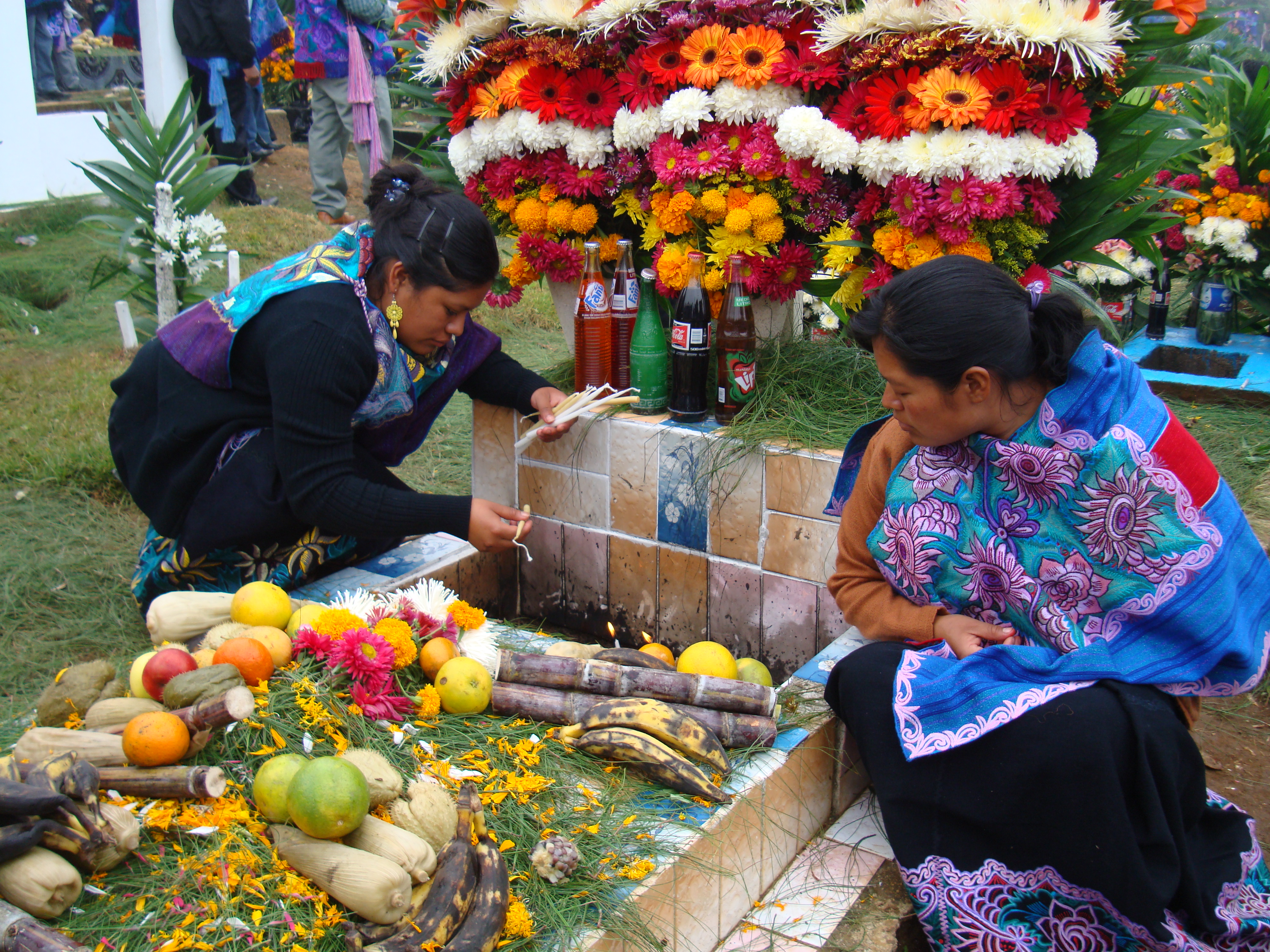 Los dias de los muertos, November 1st and 2nd, were spent in the cemeteries, which are perched on the mountains above the village. The brightly colored tombs are covered with pine-needles, their crosses decorated with expensive flowers, candles continually burning at the head of the grave. On the first day I went to the panteon arriba with Dona Juana’s family. We brought food for the dead, placing it on the grave, eating some when we were hungry. It was a day of remembrance, a time to be with family, and a day to socialize. The clouds came down and encircled us, hiding the village from view. The cemetery was filled with people wearing their trajes de fiesta, a beautiful mass of blue embroidered clothes adding to the color of the graves and flowers. The mayordomos, religious leaders, moved through the cemetery, visiting each grave and praying over them, receiving a payment of candles.